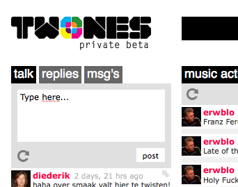 Onlangs kreeg ik de kans om Twones uit te proberen. Het Nederlandse Twones registreert net zoals Last.fm welke muziek je luistert maar doet dit net even anders. In plaats van alleen de muziek van je mediaspeler te registreren zoals Last.fm houdt Twones ook bij welke muziek je luistert op Youtube, Myspace en nog een aantal andere sites. Hiervoor moet je wel een plugin voor Firefox installeren. Met Internet Explorer werkt Twones vooralsnog niet. Nog een reden om IE bij het grofvuil te zetten.