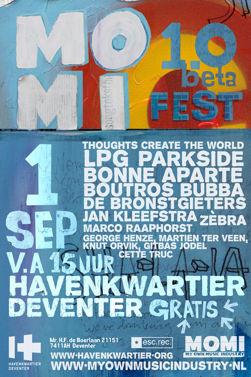 Line-up van MOMI-fest beta 1.0: LPG (muziek), Bonne Aparte (muziek), De Bronstgieters (muziek), Boutros Bubba (muziek), Parkside (muziek), Zèbra (muziek), Thoughts Create The World (muziek), Cette Truc (dj), George Henze (expo), Vormversterker (expo), Martien ter Veen (expo), Niet Voor Niets (expo), Marco Raaphorst (lezing), Jan Kleefstra (poëzie).