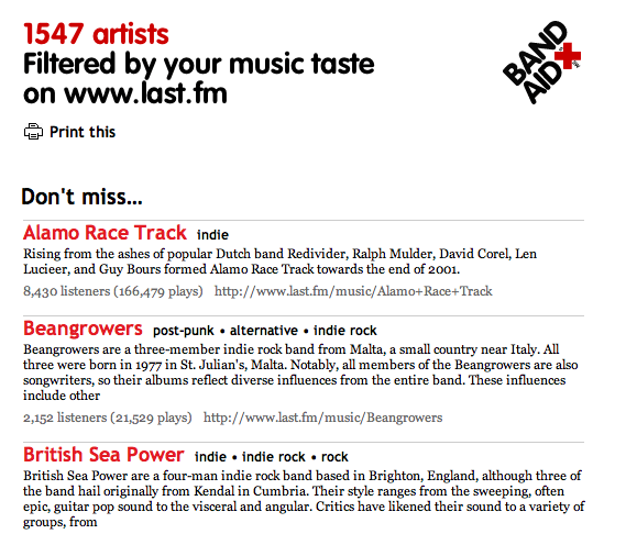 Wow! Voer je Last.fm username hier in en je weet welke bands je moet zien op South By Southwest in Austin, Texas. Ik heb helaas niet genoeg airmiles om er dit jaar bij te zijn maar zoals ieder jaar heb ik het stellige voornemen er volgend jaar bij te zijn. Hopen dat Band Aid voor SXSW dan ook nog werkt. Eurosonic/Noorderslag boekers en managers let u ook even op? Net zoals het interactive gedeelte van SXSW kun je dit ook maar beter goed jatten dan slecht zelf bedenken..